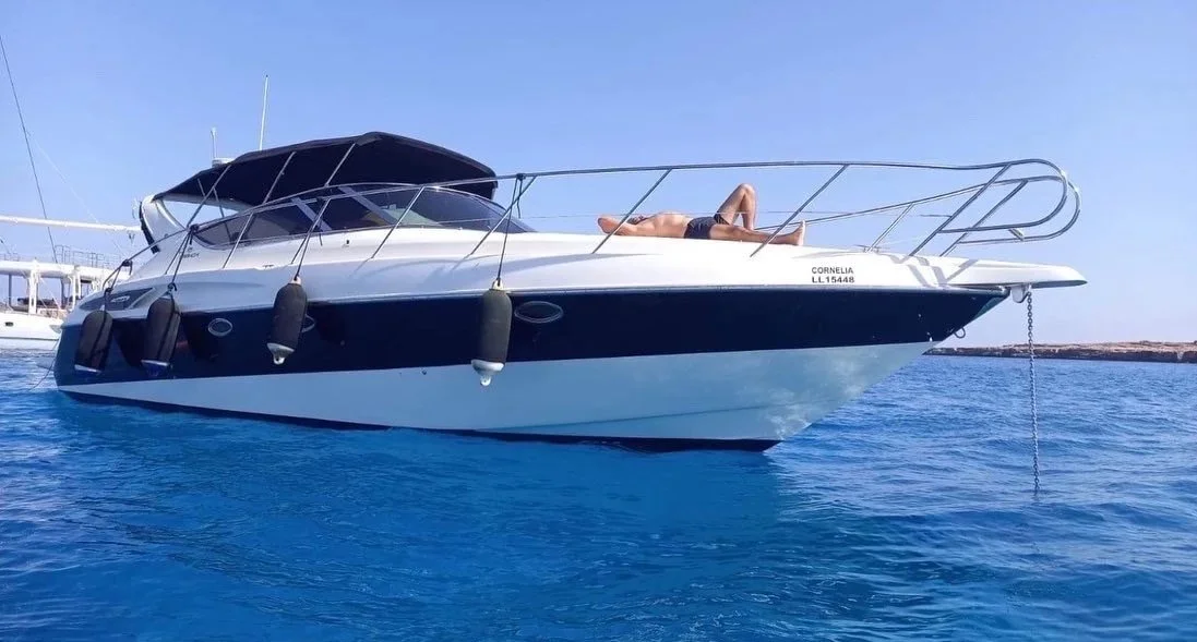 Fuel for cruising in the Ayia Napa and Protaras area, captain and crew services, sparkling wine, beer, water and seasonal fruits