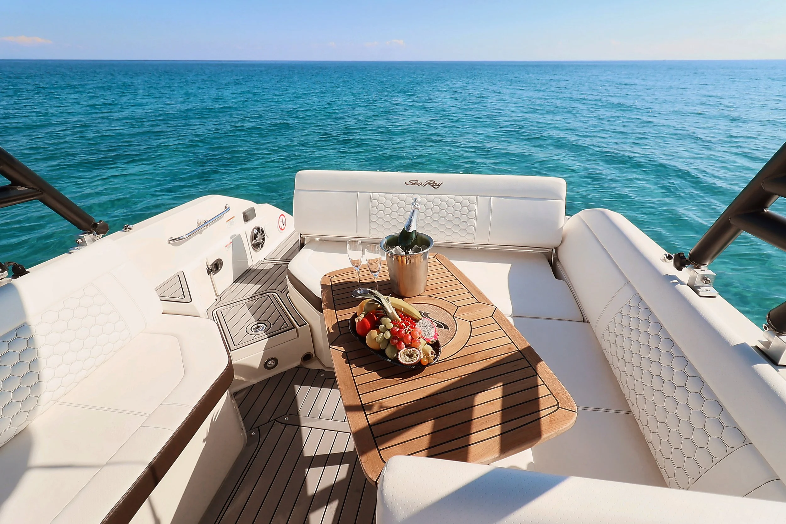 Fuel for cruising in the Ayia Napa and Protaras area, captain and crew services, sparkling wine, beer, water and seasonal fruits